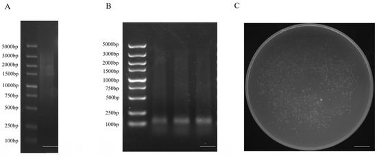 Figure 17. Construction of cDNA membrane library of S. salsa: (A) RNA extraction, M: Marker 2 kb plus, 1–4: S. salsa sample RNA; (B) ds cDNA synthesis, M: Marker 2 kb plus; 1: P1-F/P4-R amplification of ds cDNA; 2: P2-F/P4-R amplification of ds cDNA; 3: P3-F/P4-R amplification of ds cDNA; (C) ds cDNA purification; M: Marker 2 kb plus; 1: Mixed homogenization and removal of small fragments of three ds cDNAs; (C) cDNA library capacity of S. salsa yeast. Bar, 2 mm; Bar, 3 mm; Bar, 12 mm.