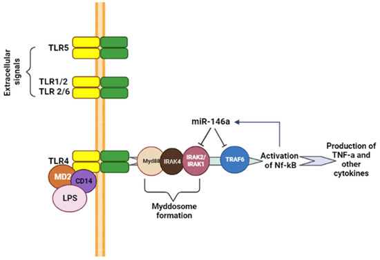 It has been observed that miRNA-146a is involved in bacterial infections, where it induces cell wall endotoxin through TLR4 stimulation in various cell types [81,82]. Moreover, there is evidence that extracellular miRNA-146a can induce cross-tolerance to LPS at the posttranslational level through degradation of proteosomal IRAK-1. This extracellular miRNA-146a is released from activated macrophages and transported to endothelial cells, resulting in a decrease in endothelial permeability and stimulation of acute inflammatory response [83].