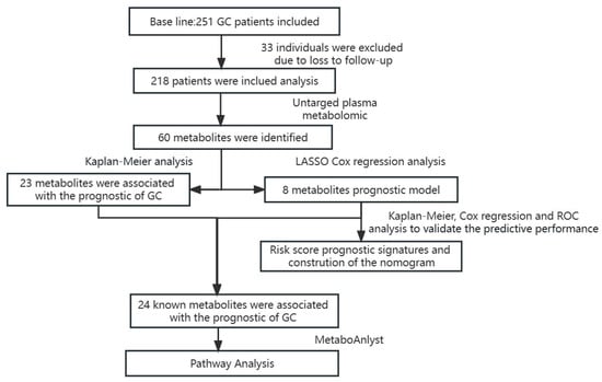 Survival rate was calculated by the Kaplan–Meier method, log-rank tests were used to compare the survival difference between two or multiple groups, and multivariate Cox regression analyses were used to analyze the relationship between metabolites and the prognosis of GC, further calculating the hazard ratios (HRs) and its 95% confidence interval (CIs). Nomogram was constructed to visualize the results of the multivariate analysis. Surv_cutpoint (“survminer”, R package) was used to separate plasma metabolites into two groups, Lasso regression was used to screen and model the metabolites most associated with survival. After calculating the risk score for each patient according to the formula (Equation (1)), the X-tile software (version 3.6, Yale University, New Haven, CT, USA) was used to find the best cut-off value. The receiver operating characteristic (ROC) curves were used to evaluate the predictive performance of the models. The MetaboAnalyst platform was used for metabolite pathway analysis. SPSS 18.0 and R 4.0 software packages were used to complete the above analysis. All p values were based on the bilateral test, and the statistical test level was α = 0.05.