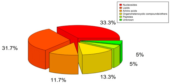 After being excluded based on Extracted Ion Chromatogram (EIC) and structurally identified by comparing with data shown in HMDB (www.hmdb.ca, accessed on 15 September 2021) and Thermo mzCloud databases, 60 compounds were identified from six chemical classes, of which 20 were nucleotides, 19 were lipids, 7 were amino acids, 3 were peptides, 8 were carbohydrates/other, and 3 were unknown metabolites (Figure 2).