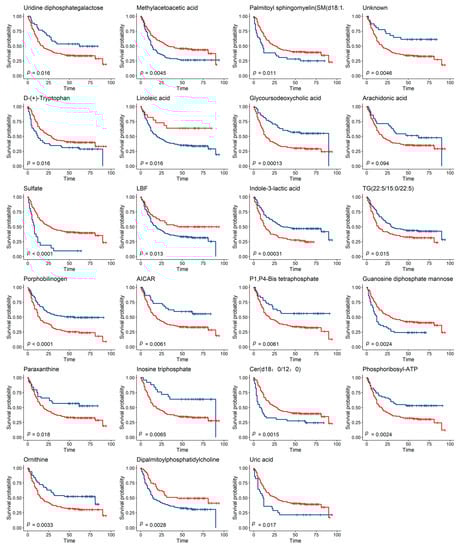 Relative abundance values of plasma metabolites are continuous variables, and we used the surv_cutpoint from survminer package (R 4.0) to select suitable cutoff points. We then divided patients into two groups based on the cutoff value of the abundance of each of the 60 metabolites and compared the differences using Kaplan–Meier (K-M) survival analysis. Our results showed that 23 metabolites were associated with the prognosis of gastric cancer (Figure 3).