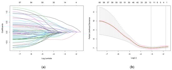 (a) LASSO coefficient profiles of the 60 metabolites. Different colors lines represent different metabolites. (b) A coefficient profile plot was produced against the log (lambda) sequence in the LASSO model. The red dots in the figure represent target parameters for each lambda value. In the graph, there are two dashed lines representing special lambda values. The first line on the left corresponds to the lambda value that minimizes the mean squared error, while the other line represents a lambda value that differs from it by one standard deviation. The optimal parameter (lambda) was selected as the first black dotted line indicated.