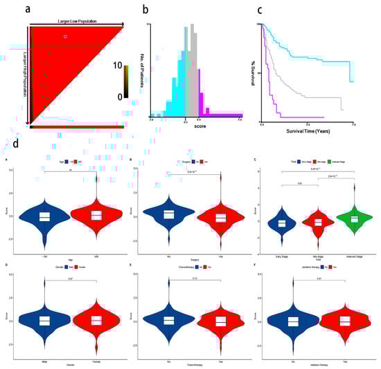 (a) The optimal cut-off points of risk scores identified by X-tile software (version 3.6, Yale University, New Haven, CT, USA); (b) GC patients were divided into three risk score levels (low, medium, and high) based on the cut-off value. The blue color represents low-risk for poor prognosis, gray represents medium-risk, and pink represents high-risk for poor prognosis; (c) K-M survival analysis shows a significant difference in survival time among the three groups (The blue line represents the low-risk group, the gray line represents the moderate-risk group, and the pink line represents the high-risk group. p < 0.05); (d) (A–F) Violin plots show that surgery and TNM stage are significant with the association of metabolite risk scores.