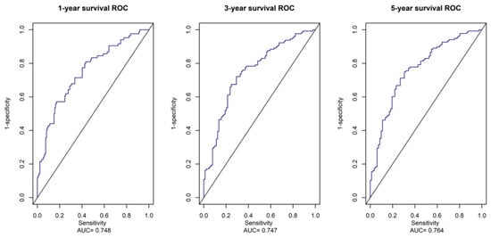 ROC Analysis of the Prognostic Metabolites Signature. The AUC of 1-year, 3-year, and 5-year survival curves show good sensitivity and specificity predictive performance of the metabolite risk scores.