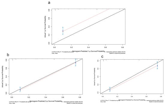 The calibration plots for the internal validation of the nomogram predicting 1-year (a), 3-year (b), and 5-year (c) survival probability. The y axis represents the nomogram actual survival, and the x axis represents the predicted survival. The diagonal dotted line represents a perfect prediction by an ideal model. The red line represents the performance of the nomogram. The blue bars indicate the confidence intervals.