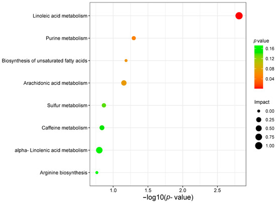 A total of 24 known metabolites were identified as being associated with survival in gastric cancer. Subsequent pathway analysis was to reveal how these metabolites influence prognosis in GC. In this study, we included 24 metabolites in the MetaboAnalyst (https://www.metaboanalyst.ca, accessed on 10 November 2021) platform for enrichment analysis and pathway analysis. The major pathway of metabolites associated with gastric cancer survival was purine metabolism and linoleic acid metabolism (Figure 10).