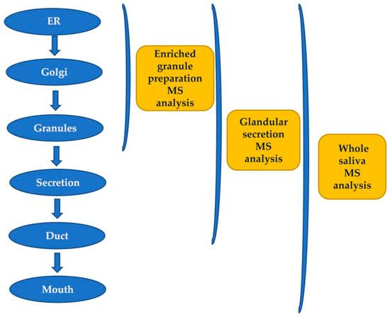 The secretory pathway for many proteins includes transit in the Golgi apparatus and storage in secretory granules preceding their release from the cell into the duct system and secretion into the mouth [5]. Most of the pre-secretory cleavages of proteins occur during the transport towards the granules of the trans-Golgi-network [6], which represents the major secretory-pathway sorting station. Glandular secretions, protein extracts from secretory granules isolated from the major salivary glands, and whole saliva were investigated by top-down proteomics to characterize and distinguish between events occurring prior to the storage in the secretory granules, those taking place between granule release and secretion into the mouth during the passage through the secretory duct, and those occurring into the mouth [6]. The workflow applied in that study is represented in Figure 1. Proteases involved in the most relevant cleavages belong to the convertase and exopeptidase families [6,7,8,9].