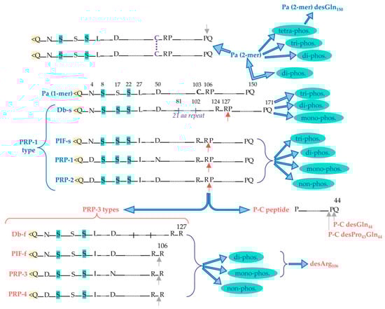 Principal acidic proline-rich protein (aPRP) proteoforms: in blue are the entire proteoforms and in red are the truncated ones. Red arrows indicate the cleavage site recognized by convertase activity, from which PRP-3-type truncated forms and the P-C peptide are generated from the entire PRP-1-type forms. Grey arrows indicate the possible loss of C-terminal residue by carboxypeptidase activity. Pyroglutamination N-terminal is evidenced in yellow, while the Ser residues that can undergo phosphorylation are evidenced in light green. The different phosphorylated proteoforms obtainable from the entire and truncated aPRPs are shown, as well as the disulfide dimeric form of Pa.