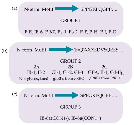 Classification of the basic proline-rich proteins (bPRPs) based on the similarity of the N-terminal motif and on the presence of glycosylations. Group 1 in panel (a), group 2 in panel (b), group 3 in panel (c).