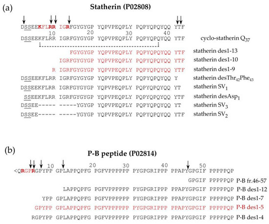 Pattern of proteoforms, mainly proteolytic fragments, originating from statherin (a), and the P-B peptide (b), characterized in human saliva by a top-down approach based on reversed-phase high pressure liquid chromatography-electrospray ionization tandem mass (RP-HPLC-ESI-MS/MS) analysis. The arrows indicate the main cleavage sites. The sequences recognized by furin-like convertase are evidenced in bold red, and the fragments derived by these cleavages are in shown in red.