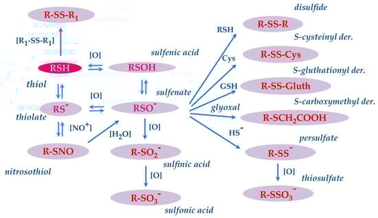 The thiol side chain of cysteine residues present in the proteins is characterized by high redox sensitivity. This redox sensitivity derives from the pKa of the thiol group, which due to the environment of the protein, even at physiological pH, may be partly present in the thiolate form (RS−) and more reactive than the thiol form (RSH). Indeed, RS− is prone to donating an electron pair to target reagents, generating the oxidized derivative sulfenic acid (RSOH), mainly present as sulfenate (RSO−), by a reversible reaction. Then, sulfenate may undergo other reversible and irreversible oxidative modifications (Figure 5) [104]. For instance, it can rapidly react with another thiols (RSH) by generating the corresponding disulfide (RSSR), or with GSH or free Cys to form S-glutathionyl (RSSG) or S-cysteinyl derivatives. This is not the only formation pathway for disulfide derivatives, since the latter can also be generated in a process termed thiol-disulfide exchange, in which a thiol form reacts with a disulfide to generate a different thiol and disulfide.