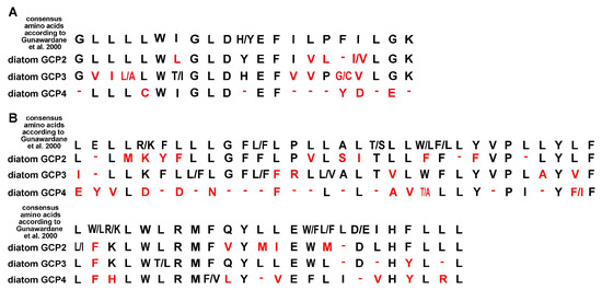 Consensus a.a. of GCP grip-motives for diatoms. For comparison, consensus a.a. according to [36] are shown. (A) grip1 motif; (B) grip2 motif. Red indicates amino acids of diatoms that differ from the consensus amino acids of other model organisms.
