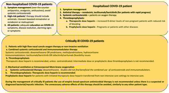 COVID-19 has the potential to progress to severe conditions, such as hypoxemic respiratory failure, acute respiratory distress syndrome (ARDS), septic shock, cardiac dysfunction, thromboembolism, liver and/or kidney dysfunction, central nervous system disease, or the worsening of comorbidities. Furthermore, weeks or months after SARS-CoV-2 infection, adults may experience multisystem inflammatory syndrome, potentially resulting in critical illness (MIS-A or, in a child, MIS-C). Thus, the therapy for COVID-19 should also include the treatment of comorbidities. The general recommendations regarding the management of COVID-19 patients with comorbidities are shown in Table 2.