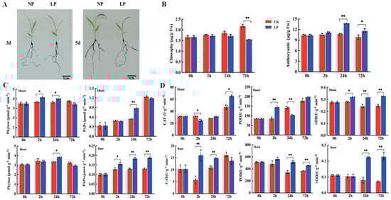 Comparison of physiological and biochemical indexes of foxtail millet at three time points under low Pi treatment. (A) Phenotype analysis of the B27 variety under low phosphate (LP) and normal phosphate (NP) treatment; (B) the chlorophyll and anthocyanin contents of B27 under LP and NP treatment; (C) activities of PAP and phytate in the shoot and root under LP and NP treatment; and (D) activities of SOD, CAT, and POD in the shoot and root under LP and NP treatment. Note: * and ** indicated significant difference at p < 0.05 and 0.01 level using paired t-test approach.