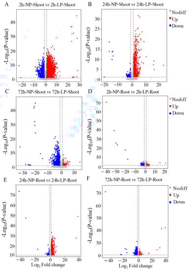 Analysis of DEGs between LP and NP treatments in the shoot and root at three time points. (A) 2 h NP vs. LP in the shoot; (B) 24 h NP vs. LP in the shoot; (C) 72 h NP vs. LP in the shoot; (D) 2 h NP vs. LP in the root; (E) 24 h NP vs. LP in the root; and (F) 72 h NP vs. LP in the root.
