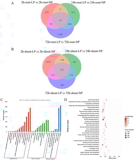 Venn diagram and GO and KEGG pathway enrichment analyses of DEGs based on comparative transcriptomic data. (A) Venn diagram of DEGs in the root for LP vs. NP at three time points; (B) Venn diagram of DEGs in the shoot for LP vs. NP at three time points; (C) GO term enrichment analysis of all DEGs derived from the root and shoot of LP vs. NP at three time points; and (D) KEGG pathway enrichment analysis of all DEGs derived from the root and shoot of LP vs. NP at three time points.