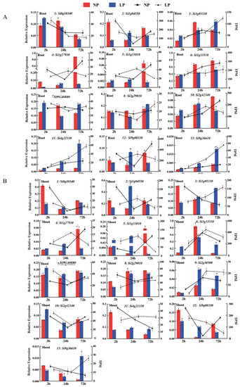 Expression patterns of 13 candidate genes in the root and shoot after LP and NP treatments at three time points. (A) FPKM values and gene expression levels determined using qRT-PCR of candidate genes in the root and (B) FPKM values and gene expression levels determined using qRT-PCR of candidate genes in the shoot.