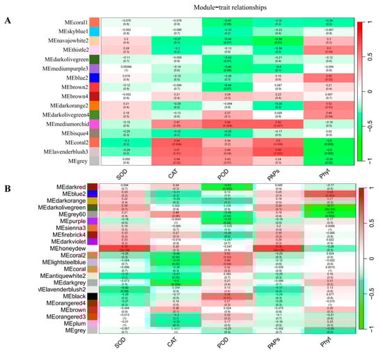 To construct gene regulatory networks under NP and LP treatments at the three time points, all DEGs of the shoots and roots were categorized into 16 and 22 modules, respectively, based on a scale-free topological model (β = 8; Figure 5A,B). To determine the correlations between the enzyme activities of SOD, POD, CAT, PAP, and Phyt activities, and DEGs, module−trait relationships were evaluated by calculating the Pearson correlation coefficients between the eigengene of each module and trait. In shoots, the MEcoral2, Melavenderblush3, and MEgrey modules were positively correlated with CAT and PAP activities (correlation coefficient > 0.5, p < 0.05). The ME mediumorchid module was significantly and positively correlated with POD and PAP activities. Methistle2, MEblue2, and Medarkorange2 were positively correlated with Phyt activities. In the roots, Mehoneydew was positively associated with SOD and PAP activities (correlation coefficient > 0.7, p < 0.01). MEblack and MEblue2 were positively correlated with Phyt (correlation coefficient >0.6, p < 0.01).