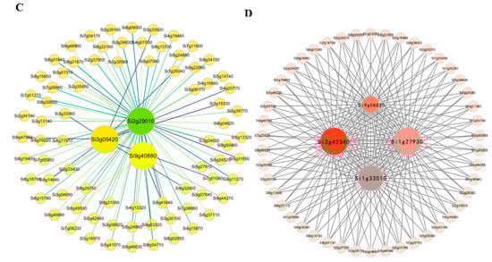 Furthermore, we constructed a co-expression network including the candidate genes Si9g40880, Si3g05420, and Si2g29010 located in the Mecoral2 module. Another co-expression network included Si1g27930, Si2g42340, Si9g08330, and Si1g33010 located in the Meblue2 module (Figure 5C,D).