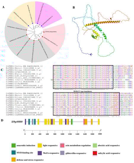 Phylogenetic tree, protein domain, sequence alignment, and cis-acting element analysis of SiPHR1. (A): Phylogenetic tree of PHR1 derived from A. thaliana, Z. mays, S. bicolor, S. virira, G. max, P. virgatum, B. vulg, and S. tuber; (B): protein structural domains; (C): sequence characteristic of the conserved domain of SiPHR1 and other species; * represents conserved amino acid residues among these species. and (D): cis-regulatory element analysis of SiPHR1(Si9g40880). Note: different background color indicated different groups in phylogenetic tree; blue five-pointed star indicated these genes belong to dicotyledon; red triangle indicated these genes belong to monocotyledon.
