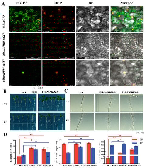 Two transgenic plants (TPs), namely Ubi::SiPHR1-GFP-8 and Ubi::SiPHR1-GFP-9, which showed higher expression levels than those in control plants and were used to further analyze phenotypes under LP treatment. The root morphology of TP in the LP-treated Murashige and Skoog (MS) medium was altered significantly, as evidenced by more lateral roots (Figure 7A) and root hairs than those in wild type (WT) plants (Figure 7B). Exposure to LP stress for 7 d inhibited primary root elongation in TP and WT plants. Compared with LP, the main root length of WT decreased by 43.91% and those of Ubi:SiPHR1-8 and Ubi:SiPHR1-9 of TP decreased by 14.42% and 22.7%, respectively. However, the length of root hairs in TP and WT plants was significantly increased under LP treatment. The lengths of root hairs in the WT and two TP plants increased by 193.84%, 63.21%, and 21.19%, respectively. The number of lateral roots in TP was significantly higher than that in WT under both LP and NP treatments (p < 0.01). Lengths of Ubi::SiPHR1-GFP-8 in TP plants were significantly higher than those of WT under LP and NP treatments. Considered together, these results suggest that SiPHR1 is associated with LP responsiveness in foxtail millet and may alter the root morphology of seedlings to manage LP stress.