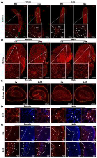 There are many types of cells or tissues that constitute the cortex. We investigated whether all cortical cells would senesce together or in a certain order. P21 was detected via immunofluorescence staining in the tissues of aged mice [18,19]. The results displayed that p21-positive production was mainly expressed in the interstitial cells within the spleen (Figure 2A), kidney (Figure 2B), and adrenal gland (Figure 2C) in 5-month-old mice.