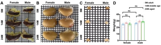 To examine the morphology changes with age, we performed routine staining via HE, PAS, and Masson. The results in 5-, 14-, and 24-month-old mice showed that the size of the spleen (Figure 3A) and kidney (Figure 3B) increased prominently with age, but the adrenal gland did not (Figure 3C). However, there was no obvious distinction in the weight of both genders (Figure 3D). Altogether, the results displayed an age-associated increase in spleen and kidney size.