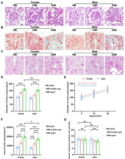 Gender-dependent changes in the glomerular diameter of an aging kidney. (A) Tissues processed for PAS staining showed that parietal epithelium cells in females were flat (black arrowhead), while they were single-layer cubic (black arrowhead) in males and had a thickened basement membrane (black arrow) and an enlarged capillary cavity (※) in both aged female and male mice. (B) Masson trichrome staining demonstrated increased renal fibrosis in mice of both genders. G, glomerulus. PT, proximal tubules. (C) Representative photomicrographs of PAS staining on sections of the mouse kidney. (D) Quantification of the average diameter of renal corpuscles. (E) Linear regression analyses showed that the renal corpuscle diameter was positively correlated with the female and male age (N = 16 each group). The square of Spearman’s correlation coefficient (R) and p values are shown. Data were statistically analyzed via linear regression (F,G). Graph represents (F) the average area and (G) number of renal corpuscles. N = 16 each group. * p < 0.05, *** p < 0.001. ns, not significant. Data are expressed as the mean ± SEM, a one-way ANOVA with Tukey’s test.