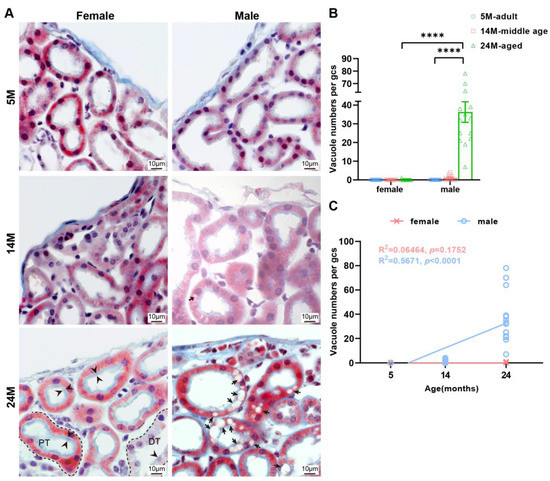 In 14-month-old male mice, only a small number of renal tubular epithelial cells in the renal subcapsular cortex contained vacuoles (Figure 5A), but the number increased significantly in the 24- month-old male mice (Figure 5B). At the same time, this phenomenon was not observed in 5-month-old male mice and female mice of all ages. This revealed that the appearance of vacuoles in the epithelial cells of renal tubules in the renal subcapsular cortex was a male-specific (Figure 5C), age-dependent change.