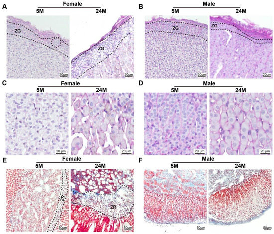 The glomerular zone of the male mouse adrenal gland cortex was thinner compared to females (A,B). Representative photomicrographs of PAS staining on the sections of the mouse adrenal gland showed that (A) the width of the zona glomerulosa (ZG) in female mice adrenal gland becomes thicker, while (B) the male globular zone becomes thinner during the aging process. (C,D). Note that the size of the ZF cells was larger with age (E,F). Adrenal gland tissues subjected to Masson staining revealed that (E) the zone reticularis (ZR), known as the X-zone, became wider with age in female mice, (F) but was absent in the lifetime of male mice.