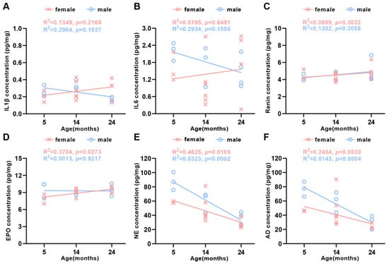 Production levels of protein secretion in the spleen, kidney, and adrenal gland in aging mice. Linear regression analyses showed that (A) IL-1β, (B) IL-6, and (C) renin were uncorrelated with the female and the male age. (D) EPO was positively correlated with female age, but uncorrelated with male age, (E) NE was inversely correlated with both female and male age, and (F) AD was uncorrelated with the female age, while it was inversely correlated with male age (N = 23 each group). The square of Spearman’s correlation coefficient (R) and p values are shown. Data were statistically analyzed via linear regression.