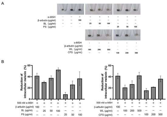 We then examined the toxicity of the four extracts on B16-F10 melanoma cells with an MTT assay. BL and PS did not induce observed toxicity on B16-F10 cells when their concentrations did not exceed 200 µg/mL, while WL and CFS treatment showed no apparent cytotoxicity at concentrations of 625 µg/mL (Figure S2).