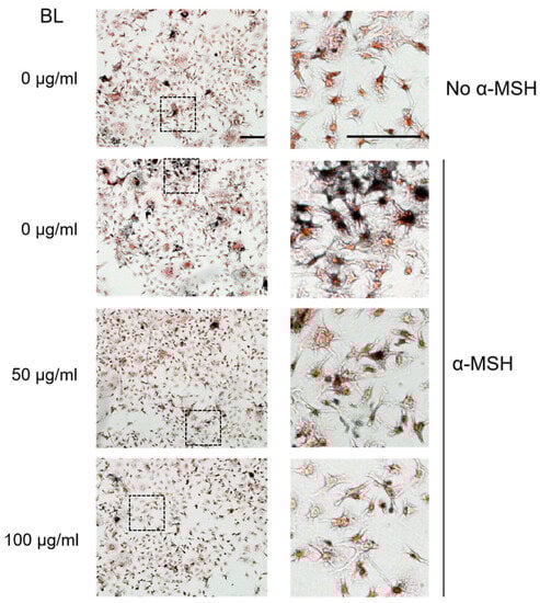 Consistent with the quantitative results of melanin reduction in the presence of ZJ1 extracts, microscopic observation of intracellular melanin stained with Masson–Fontana confirmed that BL (100 μg/mL) substantially decreased α-MSH-induced melanin upregulation (Figure 2).