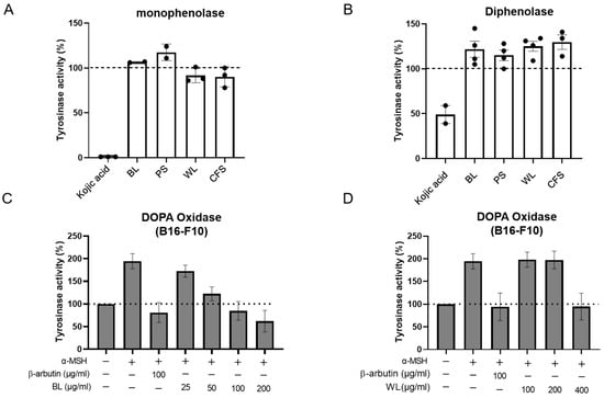The melanogenesis process is mainly catalysed by tyrosinase. Tyrosinase catalyses the conversion of tyrosine to L-DOPA which finally converts to DOPA quinone. Thus, we questioned whether the reduction in cellular melanin by BL and WL is due to the inhibition of tyrosinase activity. To address this issue, we first measured the oxidation of L-tyrosine and L-DOPA by mushroom tyrosinase in the presence of extracts. The data showed that BL and WL at concentrations that significantly reduced cellular melanin in B16-F10 cells did not inhibit tyrosinase (i.e., monophenolase and diphenolase), while kojic acid (25 μg/mL) inhibited 100% of the activity of monophenolase and 51% of diphenolase (Figure 3A,B).