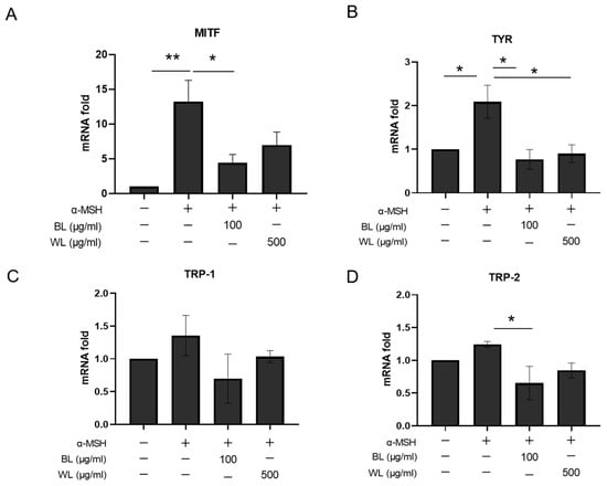 BL and WL monitor melanogenesis-related gene expression in B16-F10 cells. B16-F10 cells were exposed to 500 nM α-MSH in the presence of BL (100 μg/mL) or WL (500 μg/mL), and then mRNA levels were determined with real-time RT-PCR. (A) Mitf, 12 h after treatment with BL and FL. (B–D) Tyr, Tyrp1 and Tyrp2, 72 h after treatment with BL and FL. The histograms represent the mean ± s.e.m. of 3 independent experiments. *, p < 0.05, ** p < 0.01, one-way ANOVA.