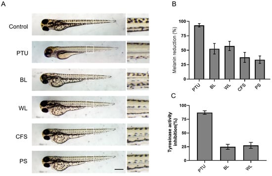 To further explore the anti-melanogenic potency of ZJ1 in vivo, we next investigated its antipigmentation activities in the zebrafish embryo model. Zebrafish larvae offer a biologically relevant model for screening antipigmentation agents because of the convenience of visualizing pigment cells through transparent larvae skin and the conserved roles of zebrafish melanophore genes corresponding to mammalian melanocyte genes []. Embryos at 24 hpf (hours post-fertilisation) were incubated with BL or WL at 80 μg/mL, a nontoxicity dose in 6-well plates. The melanin content was examined after 48 h. The imaging results showed that, at 72 hpf, the pigmentation was pronounced in the nontreated control group, while the body pigmentation was significantly decreased by PTU. PTU is a tyrosinase inhibitor [], extensively used to block pigmentation in zebrafish embryos. Importantly, ZJ1 extracts, especially BL and WL, moderately attenuated the pigmentation of zebrafish (Figure 5A). The quantification of total melanin from zebrafish embryos showed that BL reduced 52.6 ± 9.2% of melanin and WL reduced 57.5 ± 8.0% of melanin content, more efficacious than the other two extracts, CFS (37.6 ± 8.7%) and PS (33.7 ± 6.4%) (Figure 5B). Moreover, the intracellular tyrosinase activity from the lysates of BL-treated or WL-treated zebrafish was reduced by 24.9 ± 4.6% and by 27.5 ± 5.4%, respectively (Figure 5C). The data demonstrated the favourable anti-melanogenic efficacy of BL and WL in vivo.