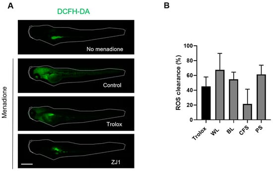 Antioxidant activity of ZJ1 extracts in a zebrafish embryo model. (A) Representative images of DCFH-DA-loaded zebrafish embryos treated with positive control Trolox (10 μg/mL) or ZJ1 extracts (25 μg/mL) in the presence of menadione to induce oxidative stress. No menadione addition was considered as the basal condition. Scale bar, 100 μm. (B) The histograms represent the mean ± s.d. of ROS clearance (%) from 8 replicates of one representative experiment (n = 3).