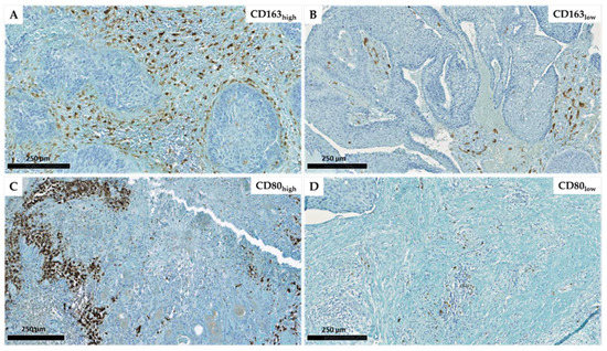 Immunohistochemical representation of CD163 expression with a high (A) and low (B) density as well as CD80 high (C) and low (D) expression in head and neck carcinomas (scales = 250 µm).