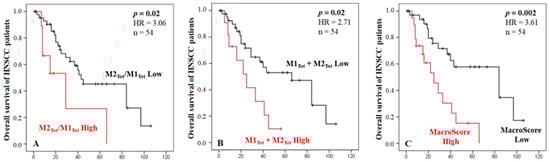 Kaplan–Meier curves of the OS of HNC patients according to the macrophages ratio score (A), the total amount of macrophages M1 and M2 infiltrating the tumor and stroma (B), and the Macroscore combining the ratio and quantity of macrophages (C). X axes are time in months.