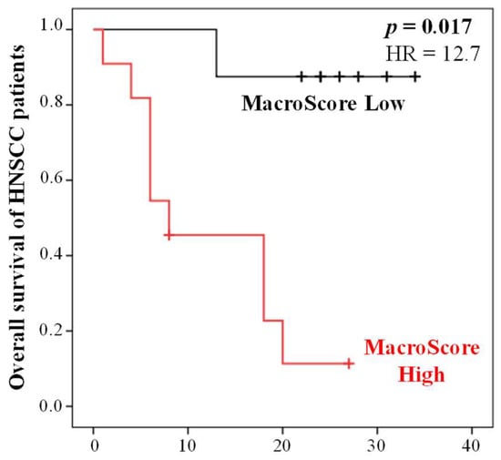 To assess the reliability of the Macroscore obtained from the training population (Table 6), an independent validation population consisting of 19 HNC patients (Table 6) was used. The analysis revealed a significant association between high Macroscore values and shorter overall survival (OS) in comparison to patients with low Macroscore values (Cox regression, p = 0.017) (Figure 3).