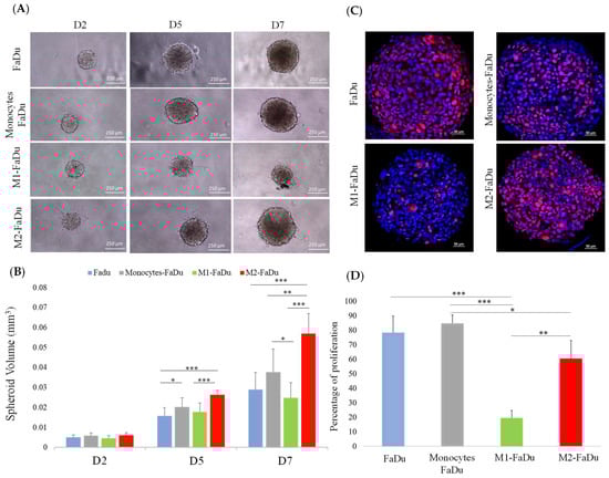 We then assessed the impact of FaDu tumor cells on the polarization state of monocytes CD14+ in the coculture spheroid model. Four types of spheroids were compared: spheroids containing FaDu cells alone, FaDu cells + monocytes, FaDu cells + M1 generated by the addition of pro-inflammatory activators (LPS and IFNγ), and FaDu cells + M2 induced by the addition of anti-inflammatory cytokines (IL4 and IL13). In each condition, eight spheroids were photographed on different days of their development (days 2, 5, and 7) to compare the growth evolution in each coculture (Figure 4A).