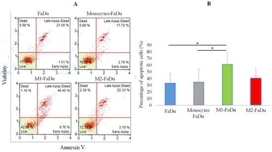 Having observed that FaDu cells continue to form larger spheroids in the presence of monocytes and M2, while M1 macrophages inhibited spheroid formations, we were interested in the apoptotic profiles of the different coculture conditions (Figure 5). To investigate this, on day 7 of coculture, spheroids were dissociated and labeled with the Annexin V/dead cell marker. As presented in Figure 5, M1–FaDu generated the highest percentage of apoptosis with more than 60% of apoptotic cells. This rate was significantly higher than those observed in the other coculture conditions except for M2–FaDu. Altogether, we reported no significant changes in the apoptotic profile between FaDu, monocytes–FaDu, and M2–FaDu with, respectively, 33.43, 35.05, and 40.77% of apoptotic cells. These data suggest that M1 may participate in tumor damage by triggering the initiation of apoptosis pathways to exert their antitumor functions.