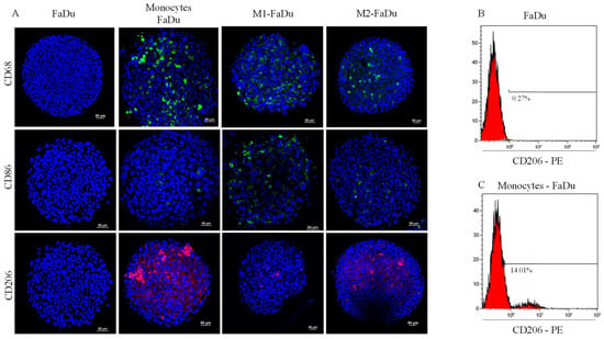 Next, a quantitative analysis of the CD206 cell surface marker in FaDu and monocytes–FaDu spheroids was performed by flow cytometry to confirm these results. Figure 6B,C demonstrate that the percentage of cells expressing the CD206-PE fluorescent emission reached 14% in monocytes–FaDu compared to 0.27% in FaDu alone, confirming the expression of CD206 by macrophages and a differentiation of monocytes into an M2-like phenotype initiated by cancer cells. Of note, 14% of CD206-positive cells in the monocytes–FaDu condition represent all macrophages that infiltrated the spheroids, as we reported a similar percentage of CD68-positive cells in the same coculture condition (as documented in Figure 6A).