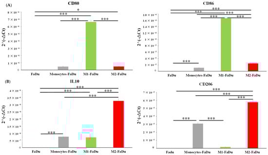 mRNA relative expression (2−ΔCt) to characterize macrophage phenotype using (A) M1 markers (CD80, CD86) and (B) M2 markers (IL10, CD206). The analyses by RT-qPCR and the normalization with 18S expression were conducted on dissociated FaDu and monocytes–FaDu, M1–FaDu, and M2–FaDu spheroids. Mean + SD, t-test, * = p ≤ 0.05, *** p ≤ 0.001.