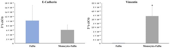 Finally, mRNA expression of EMT markers of the cancer cells was also examined in the monoculture FaDu compared to the coculture monocytes–FaDu (Figure 8). We observed a clear decreased expression of the epithelial marker (E-cadherin) along with a significant increase in the mesenchymal marker (Vimentin) (p = 0.018) in the coculture compared to the FaDu monoculture. These last results suggested that monocytes differentiated in macrophages with cancer cells may promote the EMT process, as it is a reported function of M2 macrophages on cancer cells.