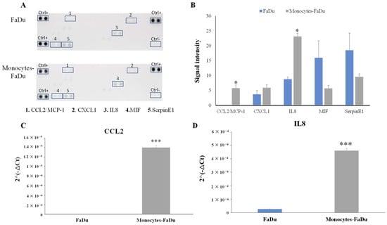 Human Cytokine Array Membrane (A,B) of supernatant of FaDu cancer cell spheroids and monocytes–FaDu spheroids on day 7. (A) Membranes. (B) Quantification showing the mean signal intensity (n = 3) normalized to positive control (Ctrl+). mRNA relative expression (2−ΔCt) of CCL2 and IL8 cytokines (C,D). Analyses by RT-qPCR and normalization with 18S expression on dissociated FaDu and monocytes–FaDu spheroids. Mean + SD, t-test, * = p ≤ 0.05, *** p ≤ 0.001.