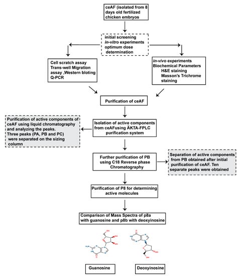 Schematic illustration of the extraction and purification of the active components, guanosine and deoxyinosine, from native ceAF. We first determined the biological activity of ceAF as a whole. Later, once it was established that ceAF possesses optimum wound healing properties, ceAF was subjected to several purification techniques, including the ÄKTA-FPLC purification system and reverse-phase chromatography, which led us to the structural analogs of guanosine and deoxyinosine when compared with the mass spectra of the chemical structures of these chemicals.