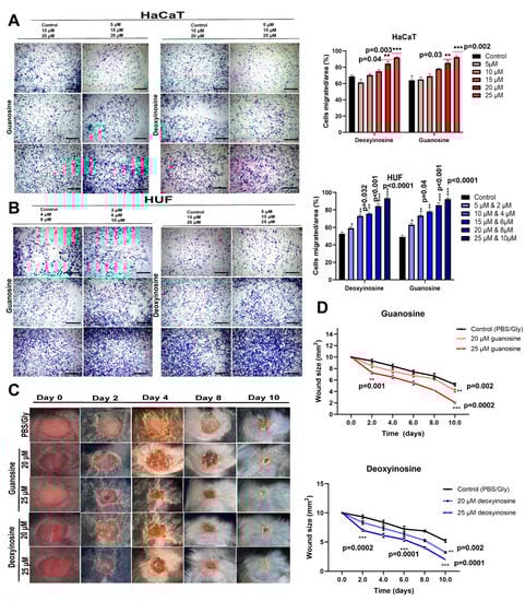Trans-well migration assay for keratinocytes and fibroblasts treated with deoxyinosine and guanosine ((A,B); quantification on right panel, scalebar represents 100 μm). Different dosages of deoxyinosine and guanosine were supplemented with fibroblasts and keratinocytes. Later, the relative number of cells was evaluated using ImageJ software. All experiments were repeated at least three times. Significance was measured using a one-way ANOVA followed by a Dunnett’s multiple comparisons test to compare the control group (10% FBS) with other groups. * p < 0.05, ** p < 0.01, *** p < 0.001. Accelerated wound healing by means of treatment with guanosine and deoxyinosine isolated from ceAF. Wounds receiving no treatment (control), with different concentrations of guanosine and deoxyinosine (20 and 25 μM) at the time of wound induction (Day 0) till the complete healing (Day 10) are shown in (C). Fractions of wounds healed with 25 μM of guanosine and deoxyinosine at different time intervals are shown in (D). Statistical significance was evaluated with a two-way ANOVA with a Bonferroni post-hoc test. (n = 5/group) and ** p < 0.01, *** p < 0.001.