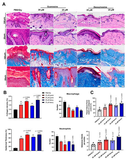 Representative images of H&E staining of inflammatory cells in wound tissues using guanosine and deoxyinosine. Guanosine and deoxyinosine affect the generation of extracellular matrix components (A). Histological analysis of fibroblasts and collagen fibers using Masson’s trichrome staining is shown. Tissues of wounds were obtained after 10 days post-healing. The scale bar represents 100 μm for the upper panel and 20 μm for the bottom panel. The relative quantification of epidermal thickness, collagen density macrophage infiltration, and the number of neutrophils is shown in the bottom panel (B). Data have been represented as mean ± SD, where n = 5/group and *** p < 0.001, ** p < 0.01, and * p < 0.05. Histological quantification of dermal thickness and wound healing parameters, including the number of sebaceous glands per section and fraction of ruptured skin evaluation while comparing with uninjured skin (C). Each point represents the average of two sections from two separate slides of one wound. Each dot point represents one animal and all the analysis was performed using a one-way analysis of variance (ANOVA). Data have been represented mean ± S.D, where n = 5. Data expressed as * p < 0.05, ** p < 0.001, *** p = 0.0001 and **** p < 0.0001.
