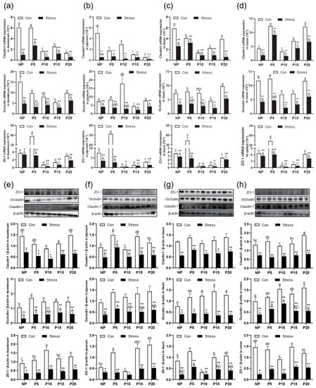 Effect of chronic stress on the relative tight junction mRNA and protein expression level of intestine in pregnant mice. (a–d) Effect of chronic stress on the relative ZO-1, Occludin, and Claudin-1 mRNA expression level of duodenum (a), jejunum (b), ileum (c), and colon (d) in pregnant mice (n = 6). (e–h) The expression of tight junction protein ZO-1, Occludin, Claudin-1, and β-actin protein were examined by western blotting in duodenum (e), jejunum (f), ileum (g), and colon (h) after stress in pregnant mice, and relative protein levels were normalized to β-actin (n = 3). * p < 0.05, ** p < 0.01. Letter casing represents the comparison of different segments at the same age by one-way ANOVA. The lowercase letters represent the comparison of different segments of the control groups at the same age, and the uppercase letters represent the comparison of different segments of the stress groups at the same age. The same letter indicates that the difference is not significant (p > 0.05), while different letters indicate that the difference is significant (p ≤ 0.05).
